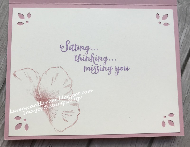 I used the Timeless Tropical Stamp Set to stamp the flowers in Highland Heather. I had watched Dawn's You Tube Video and thought I remembered everything. However, I stamped a "Hello" in the bottom right corner before I adhered the sentiment mat...a mistake that didn't matter much because it just changed my design a bit! I added some retired Blushing Bride hearts and a little linen thread bow.