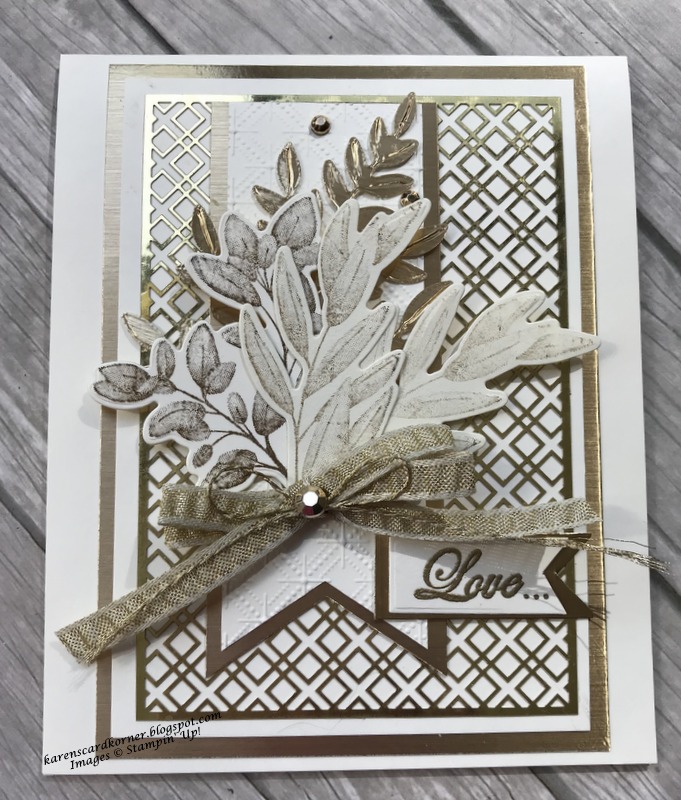 The frame is cut out with the Stitched Rectangles Dies using Gold Foil paper. Again, I used retired stamp sets: Flourishing Phrases and Beautiful Bouquet...also gold embossed. I stamped the fern leaf from the Forever Fern Stamp Set in gold ink, stamped off once.