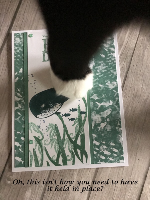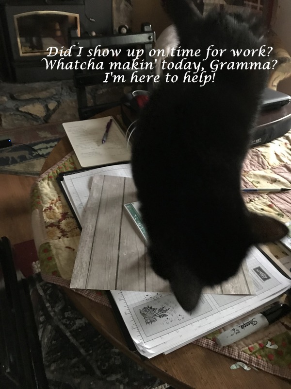 Yes, that's Lord Chesterfield (Chester) in action. He loves to be with his Gramma when I'm creating. I'm thankful my ink pads are closed when he investigates...I mean goes to work!